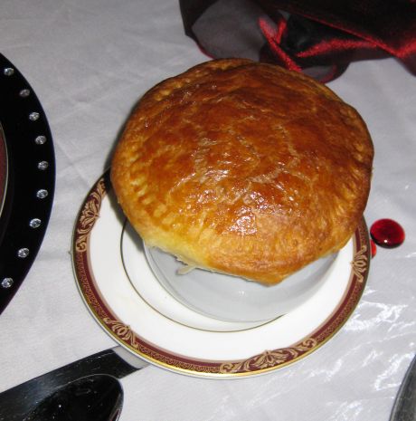 Underneath the puff pastry is a rich and tasty roasted tomato soup. |