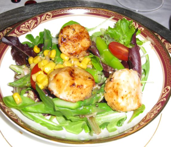 Pan seared scallops with mixed green salad specially prepared by Maily. |
