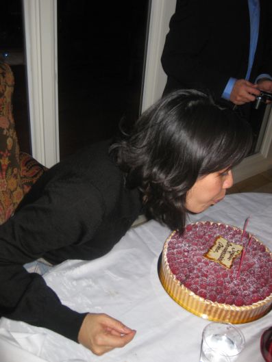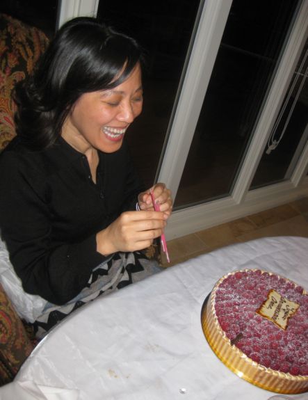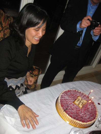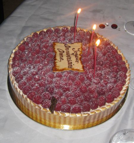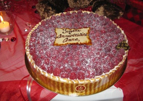 Birthday cake by Fleur de Cocao in Los Gatos. This cake is called a Satin - A creamy yet light white chocolate mousse with brandied raspberries, ladyfinger sponge cake, and soft Italian meringue!