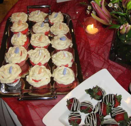 On top of the picture is a tray of red velvet cup cake baked with love by Ryan. |
