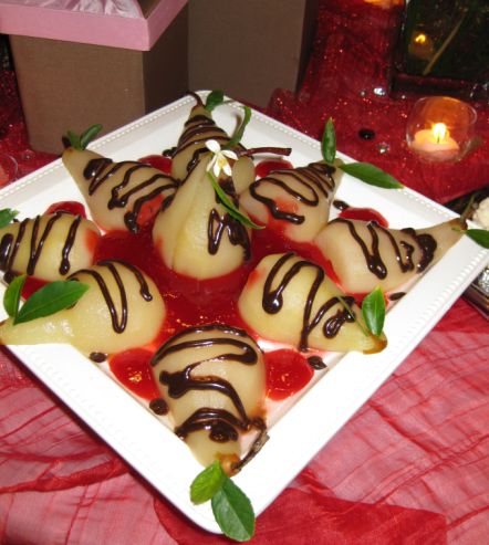Hanh prepared a beautiful plate of Poached Pears in wine served with a raspberry sauce and drizzled with chocolate |