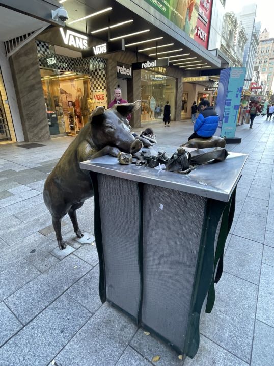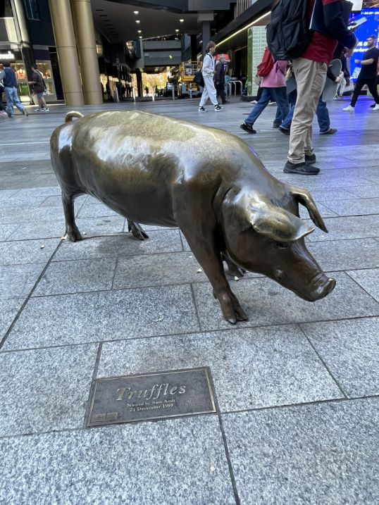 The pigs scattered along Rundle Mall. They’re made of bronze, slightly polished by years of people touching them for luck and photos.