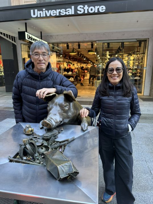 The pigs were inspired by the idea that Rundle Mall is a place where people “forage” for the best deals and treats, just like pigs hunting for truffles! Their playful poses and life-sized design invite people to interact, pat, and take photos with them.