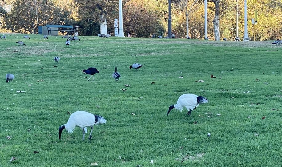 The Australian white Ibis are the large white birds with long curved black bills and black head, often called “bin chickens” in Australia, though they’re quite graceful up close. They were originally wetland birds, but many have adapted to urban life, especially around parks and rivers.