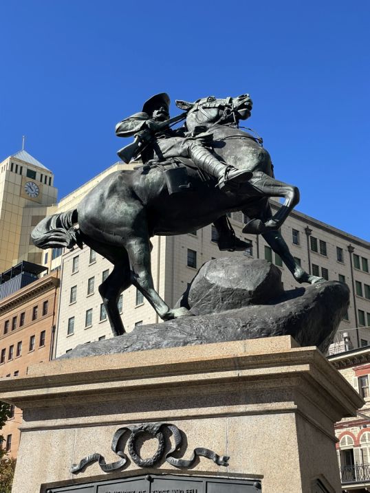 The memorial features a bronze equestrian statue of a mounted soldier, created by Adrian Jones, a British sculptor and former cavalry officer. The soldier is shown on horseback, looking ahead with calm determination, symbolizing courage and duty. The base is made from granite, with plaques listing the names of the fallen and inscriptions commemorating their service.