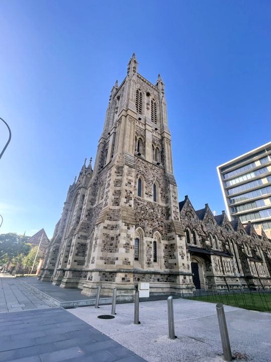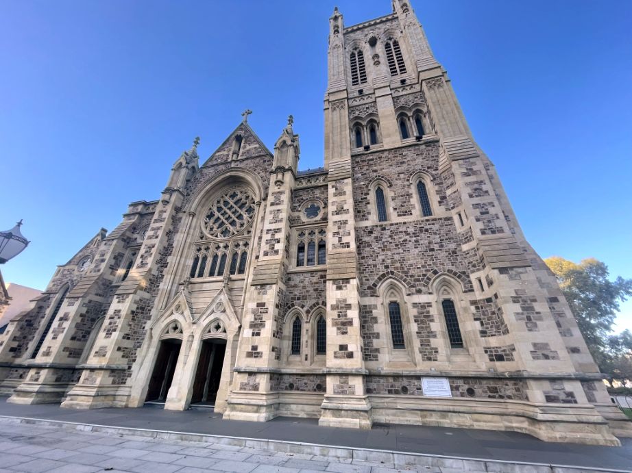 The original design was by English architect Richard Lambeth, in the Gothic Revival style that was inspired by medieval European cathedrals. The cathedral is built mainly from stone quarried in Adelaide and Glen Osmond, giving it a warm cream-grey tone that stands out beautifully against the blue South Australian sky.