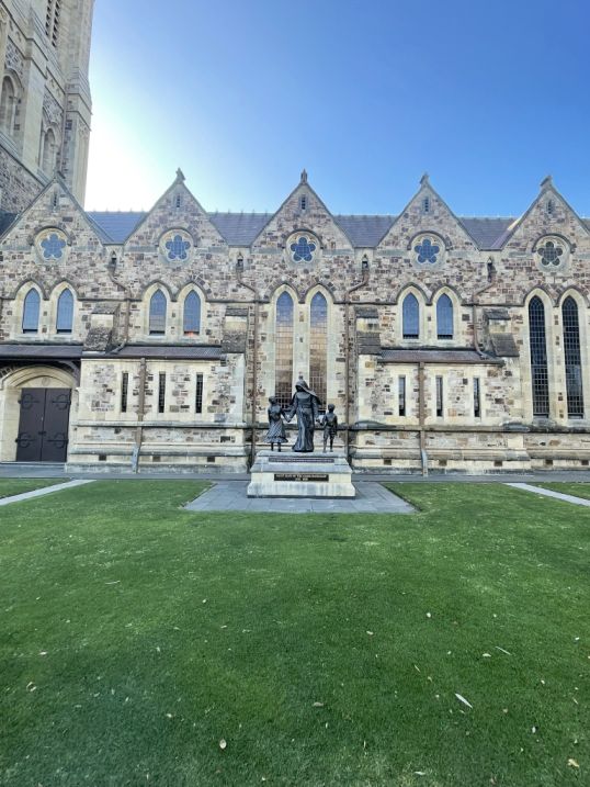 Set within the peaceful courtyard beside the cathedral, the statue offers a quiet place for reflection and a reminder of compassion, service, and faith, values that still shape the spirit of Adelaide’s Catholic community today.