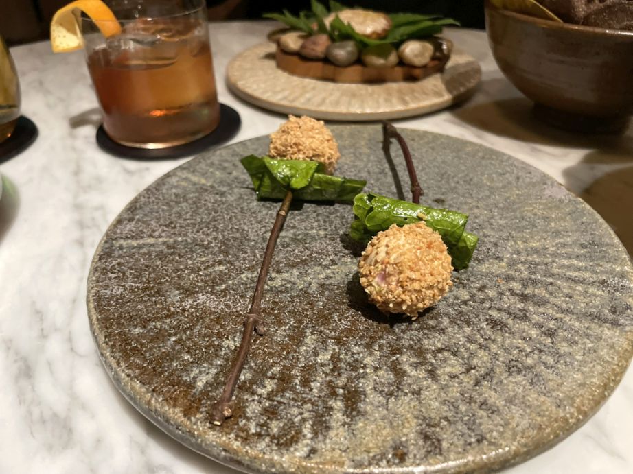 We were served a playful little bite, a radish lollipop paired with a small roll of green leaves beside it. The presentation was whimsical, almost like something from a garden in miniature.