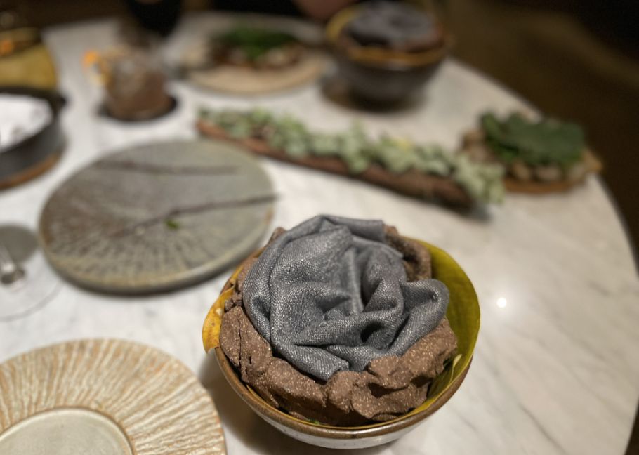 Small toast with saltbush was presented so beautifully that we almost didn’t want to touch it. The toast rested on a branch tied with rope, decorated with sprigs of saltbush leaves, looking like something freshly gathered from the wild. The toast itself was crisp and savory, infused with the gentle, salty aroma of the saltbush.