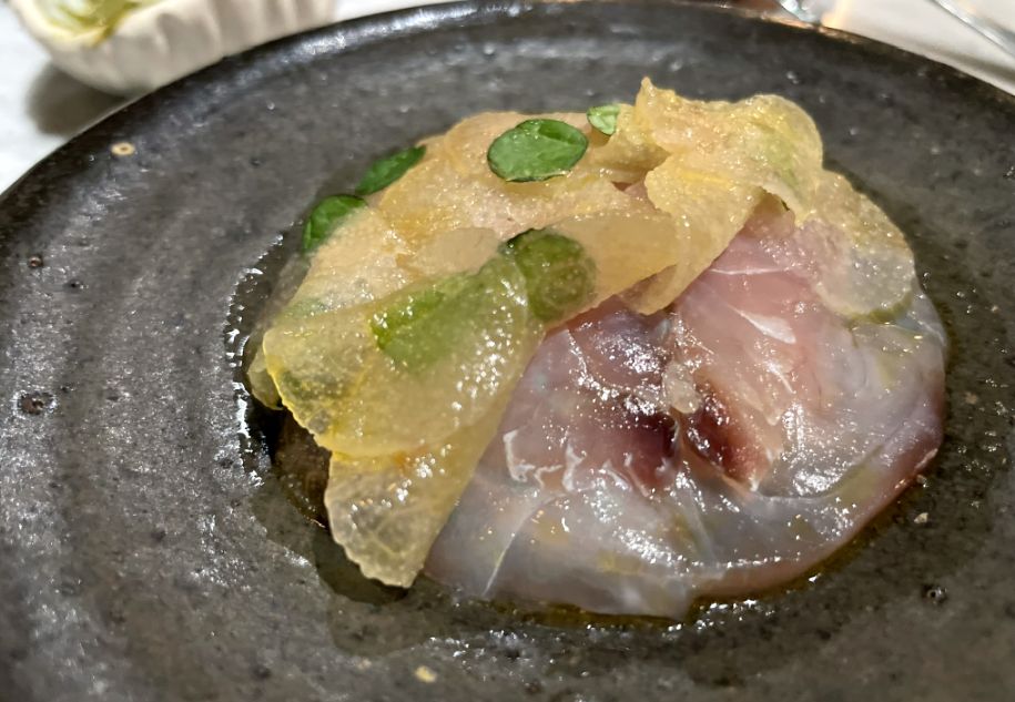 The next dish was a hamachi crudo, arranged in a perfect circular mound. On top, a thin layer of pear was laid so delicately it looked almost translucent, each slice overlapping like soft petals. Scattered over the pear were small, round-cut leaves, precise and symmetrical, adding a touch of green that made the whole dish look like a living piece of art.