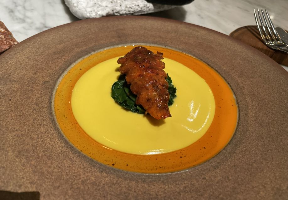 The next course was truly striking, a roasted Australian lobster tail resting on a small bed of deep-green leaves, surrounded by a ring of silky, golden carrot purée. The purée was so smooth it looked like glass, and around it glowed a halo of orange oil that caught the light beautifully. The lobster was tender and slightly caramelized, its surface glistening with a buttery glaze. The greens underneath added a subtle earthiness, balancing the sweetness of the carrot and the richness of the shellfish. The presentation was perfectly circular, vibrant, refined, and full of warmth.