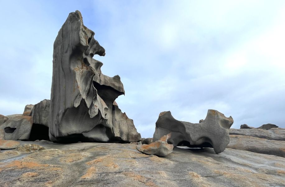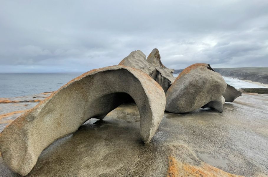 The next stop is at the Remarkable Rocks, one of Kangaroo Island’s true icons, and the landscape around them tells a powerful story of both ancient geology and recent recovery. Remarkable Rocks sit within Flinders Chase National Park, and they are more than 500 million years old, older than most mountain ranges on Earth. They’re made of granite, formed deep underground from molten magma that cooled slowly. Over hundreds of millions of years, wind, rain, and waves sculpted the exposed granite into the surreal, smooth, hollowed shapes you see today, some look like shells, others like animal silhouettes or giant sculptures. The first European to describe them was Matthew Flinders, the British navigator who charted much of Australia’s coastline in the early 1800s. He called them “remarkable” in his journal, hence the name Remarkable Rocks.