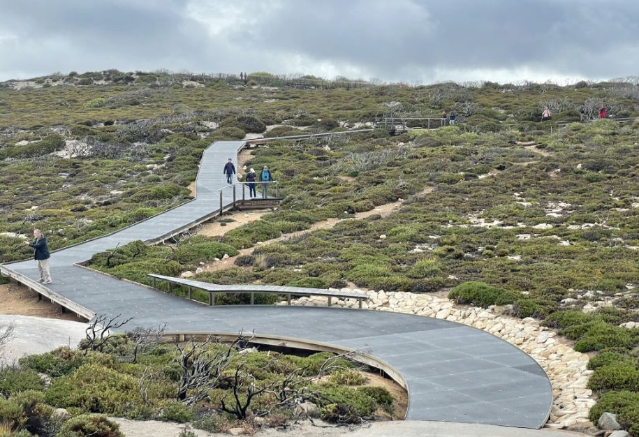 As we walked further, the path rises slightly, and then, quite suddenly, the landscape opens up. Ahead is the Southern Ocean stretches endlessly, and the silvery clouds above cast a pale glow over the landscape. The green shrubs and re-growing trees along the path appear deeper and richer in color.
