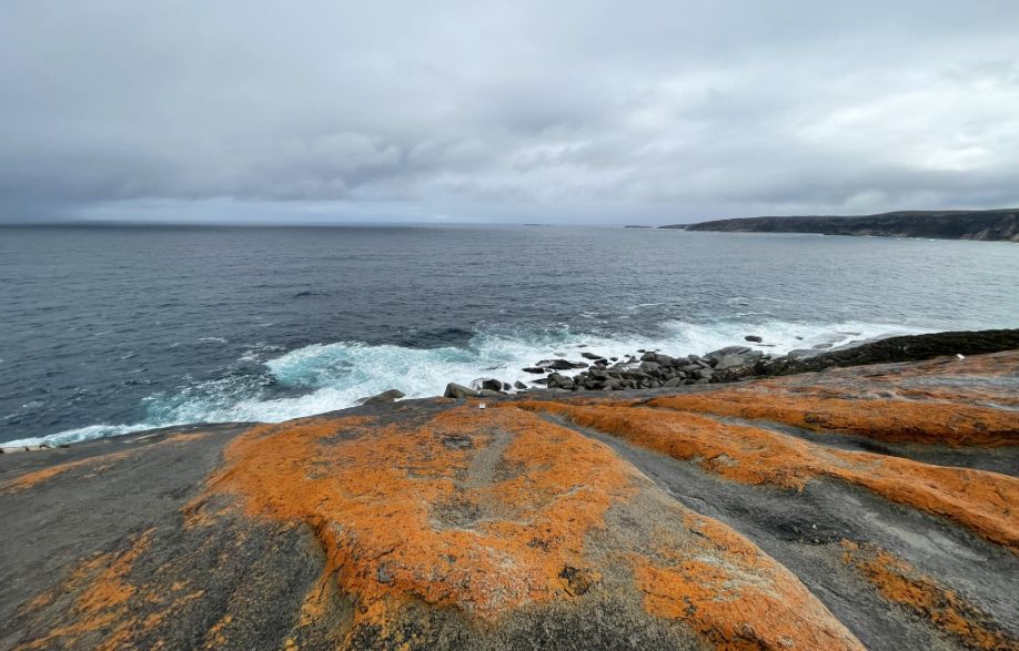 At our feet, the granite surface glows with bright orange lichen, the color strikingly vivid against the cool tones of the ocean and sky. The patches spread across the rock like living paint, glowing orange, rusty red, and even a hint of yellow in some places.