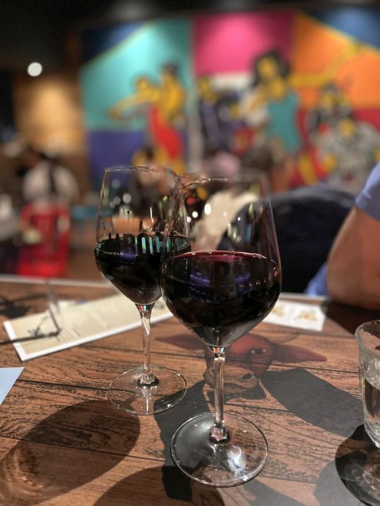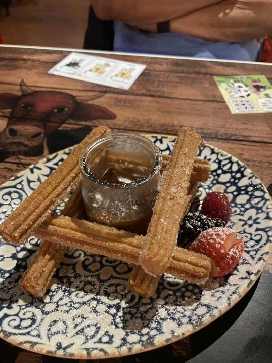 The table we sat at with “La Boca Bar and Grill” written on top and a cow in a tuxedo lying down is part of the restaurant’s playful, artistic décor that celebrates Argentinian culture with a touch of humor.