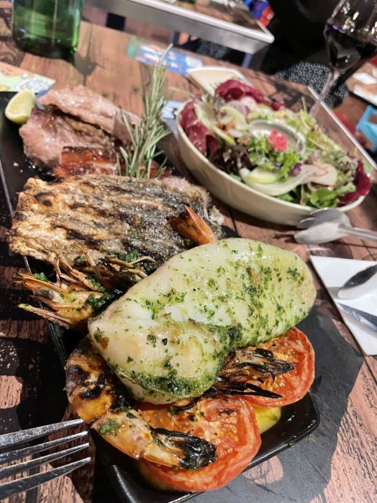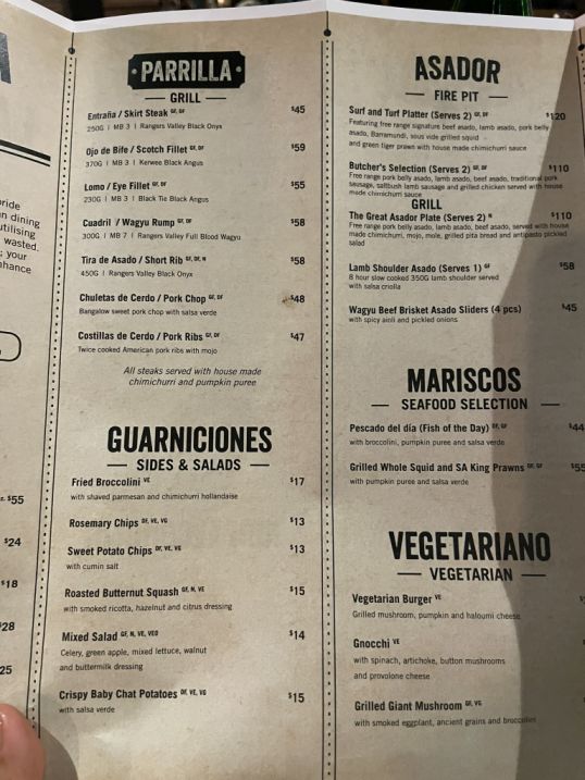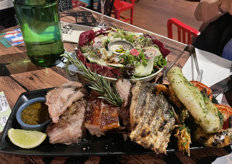 The platter features free range signature beef asado, lamb asado, pork belly asado, Barramundi, sous vide grilled squid and green tiger prawn with house made chimichurri sauce.