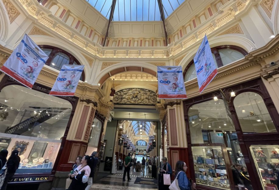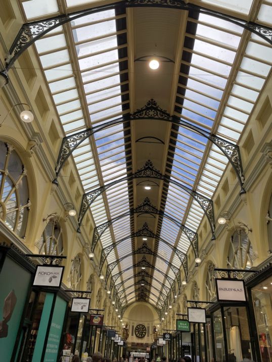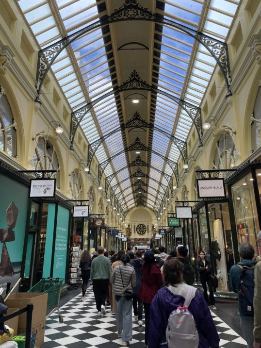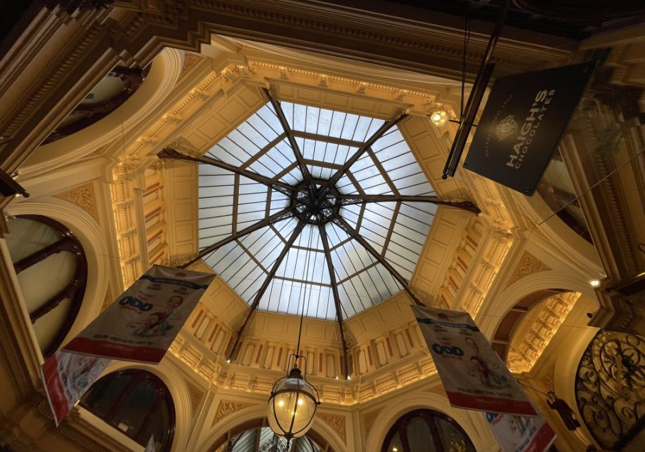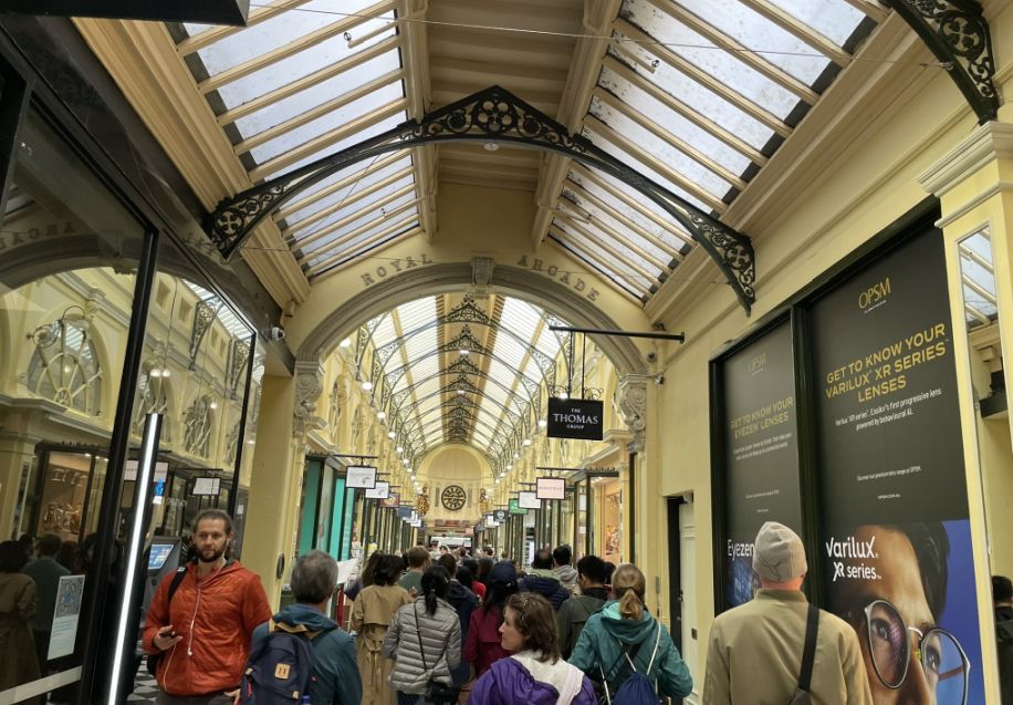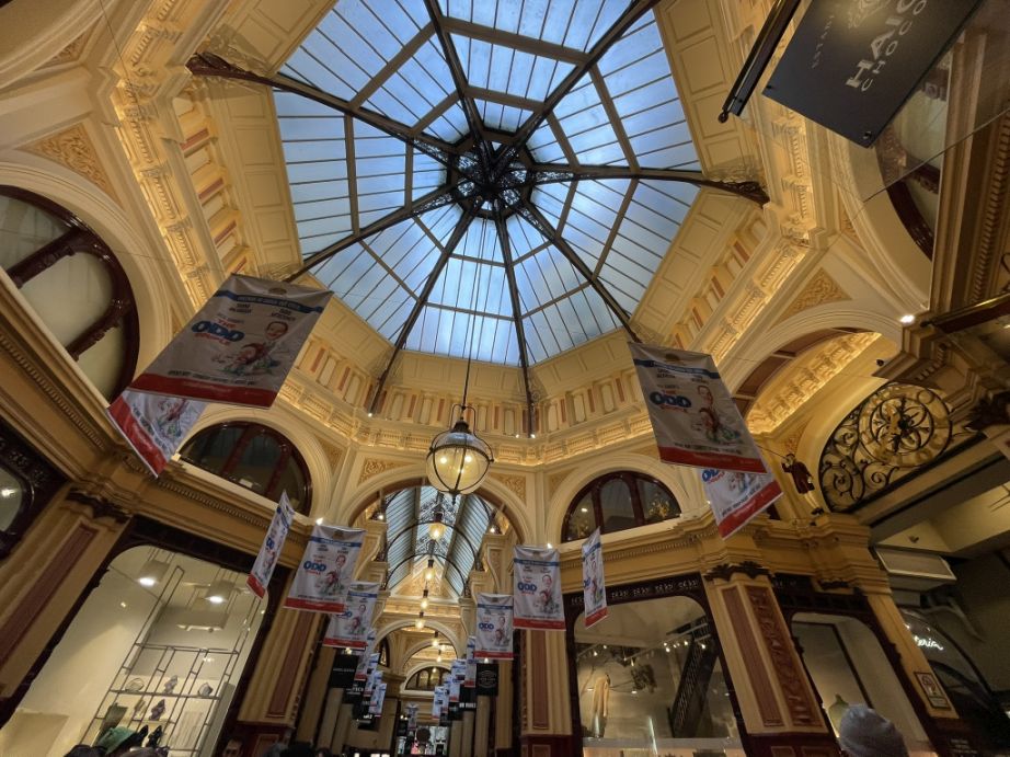 Walking past the arched shop fronts, with their tall glass displays framed by carved wood and iron, you get a sense of stepping back into the 19th century. The light from the glass ceiling reflects off the tiled mosaics, and with the buzz of cafes and the elegance of the boutiques, it feels more like a grand European galleria than a shopping arcade in Melbourne.