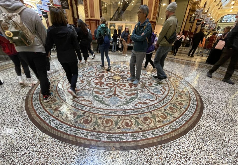 We are now inside the Block Arcade, one of Melbourne’s most beautiful and historic shopping arcades. The circular space with the glass roof and the ornate floor mosaic is known as the Rotunda of the Block Arcade. It’s the central highlight of the arcade, where the corridors meet.