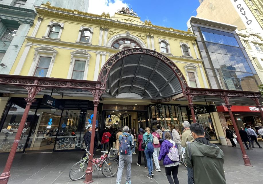 The entrance on Bourke Street is crowned with a curved pediment and decorative flourishes that make the whole arcade feel grand before you even step inside.
