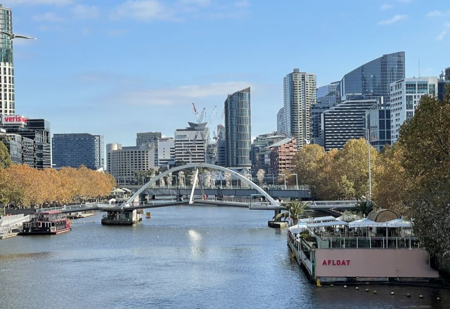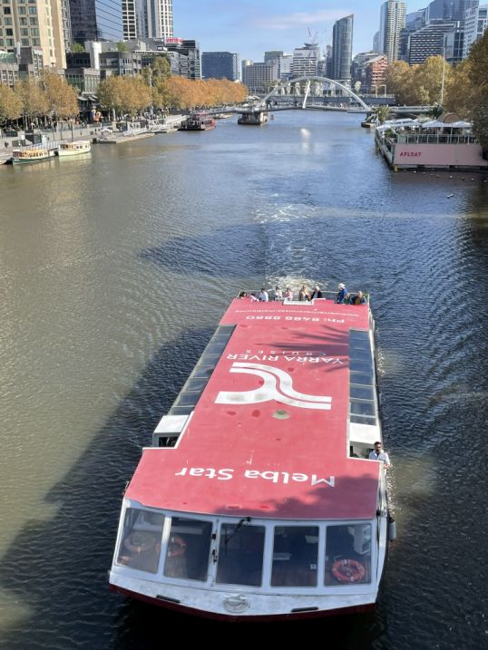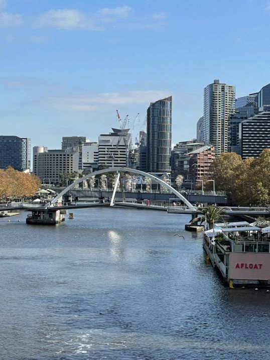 On the right is the Arbory Afloat, a seasonal bar and restaurant set right on the river. It’s built like a giant decked pontoon, so people can sit, eat, and drink literally on top of the water. It’s become one of Melbourne’s most popular riverside hangouts, especially in the summer.