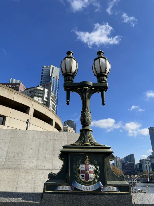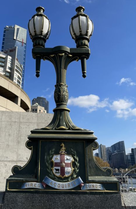 Cast Iron Street lamps on Princes Bridge was installed in 1926, a long time after the bridge was opened in 1888. The Melbourne coat of arms with the motto: :Vires Aquirit Eundo" translates as: We gather the Strength as we go".