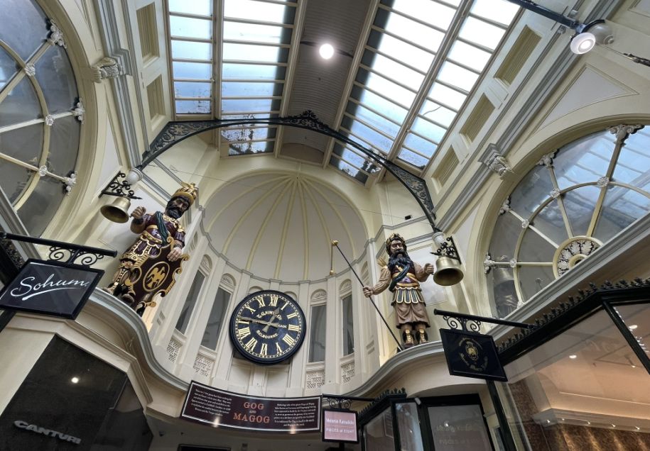 The famous Gaunt’s Clock and the legendary figures of Gog and Magog. Gog and Magog are two large carved figures, painted in gold and green, standing on either side of the clock. They represent ancient mythical giants said to be guardians of London. In Melbourne’s arcade, they’ve been standing since 1892 as symbolic protectors of the city.