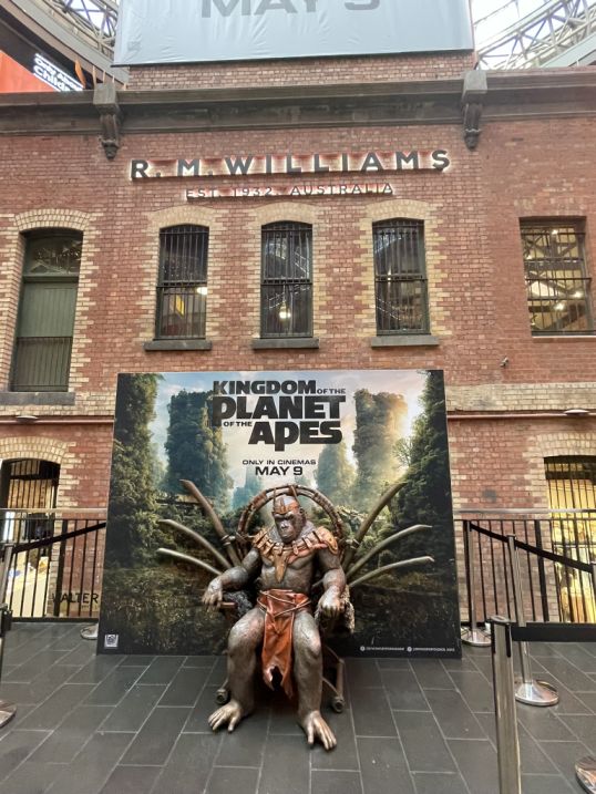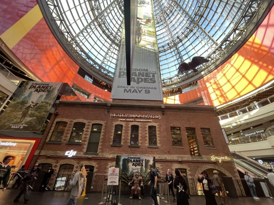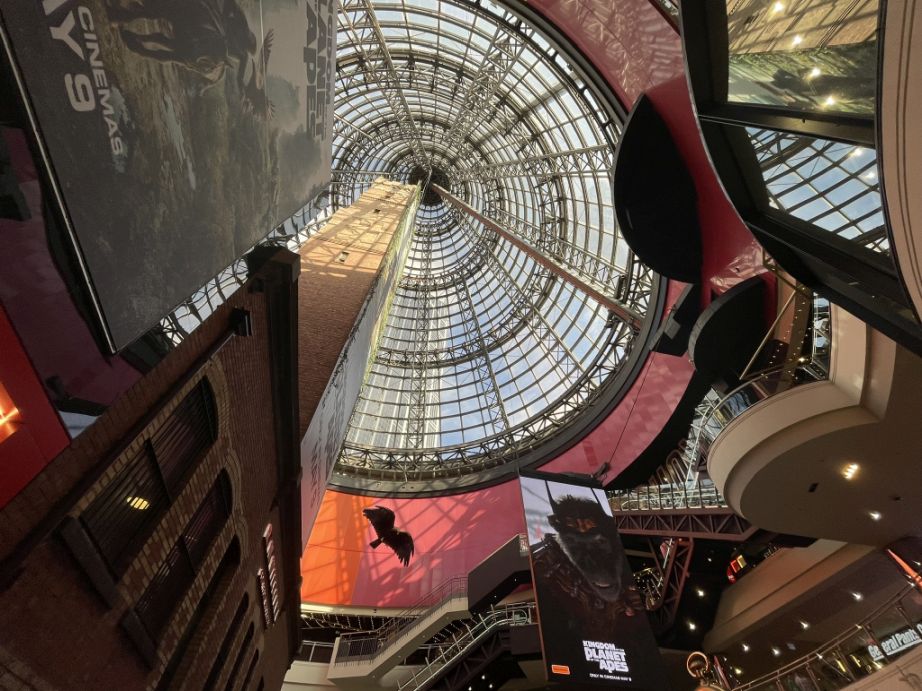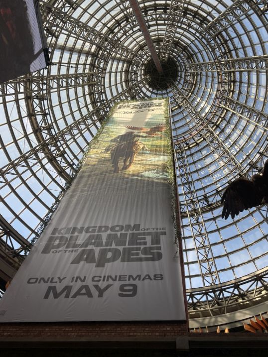 Beneath the dome, they hung a long vertical banner/poster for “Kingdom of the Planet of the Apes”, advertising its upcoming May 9, 2024 premiere. Film studios often choose spots like this because the dome height gives enough vertical space to create a striking, immersive display that passersby can’t miss. The soaring height, the circular frame, and the natural light filtering through the glass all combine to make the dome feel like a miniature theatre ceiling, every installation beneath it feels staged and larger than life. That’s why visitors often remember these displays years later.
