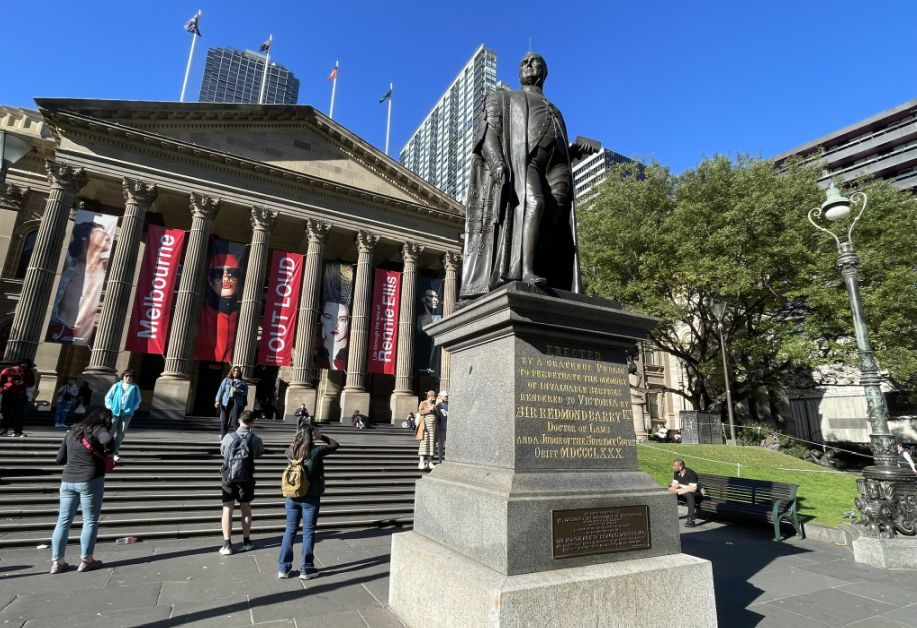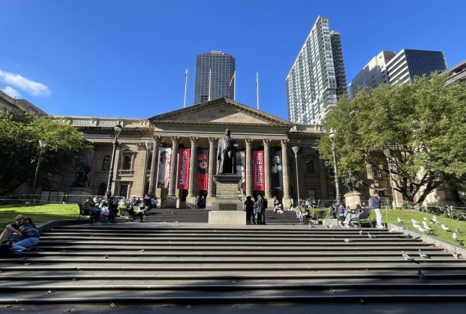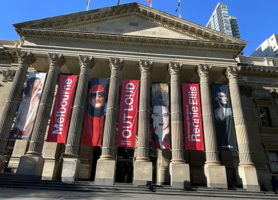 The State Library Victoria was hosting an exhibition dedicated to Rennie Ellis (1940–2003), one of Australia’s most iconic social photographers. The long red banners draped across the library’s front with the words “Melbourne Out Loud” were part of the exhibition design, making a bold statement to invite people inside. They really stood out against the neoclassical stone façade.