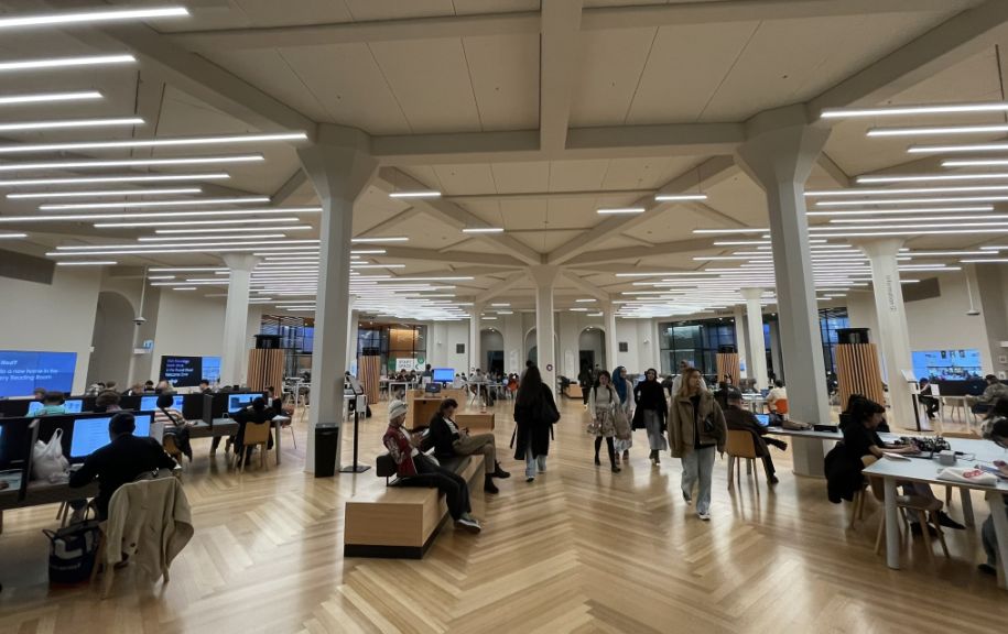 If you look at the white wall, you will see a bunch books on displayed and they are not just random decorations. They are part of carefully curated exhibitions and displays designed to showcase highlights from the library’s enormous collection of more than 2 million books and hundreds of thousands of rare items. Many of these books are rare, fragile, or historically significant volumes, things like early colonial publications, illustrated works, or first editions that normally wouldn’t be accessible on the open shelves. T