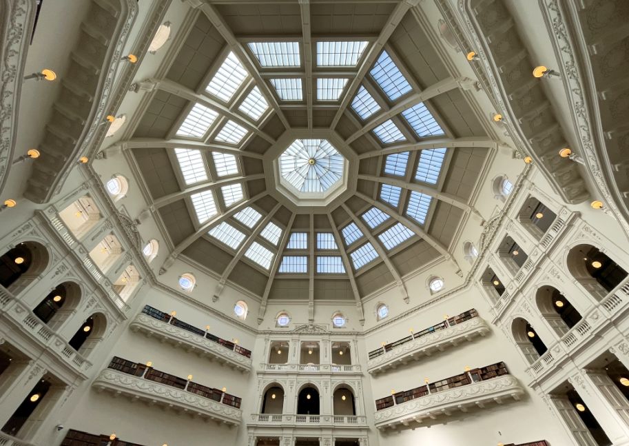 We are now in La Trobe Reading Room, first opened in 1913, often called the Domed Reading Room, located on the 2nd floor and is the heart of the State Library Victoria. The space is famous for its octagonal design, with soaring white columns, wooden desks arranged in a radial pattern, and a majestic glass-and-steel dome overhead, one of the largest of its kind in the world when it was built.
