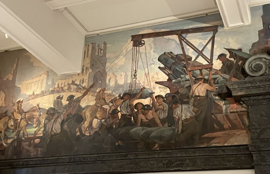 The painted murals were created in the 1920s–30s as part of the library’s embellishments. They depict scenes of learning, culture, and sometimes historical references tied to Melbourne and Victoria. This mural reflects the immense effort of Australian soldiers during World War I, especially on the European front. The church in the backdrop suggests a European setting, probably France or Belgium, where Australians fought in towns devastated by war. The mural emphasizes both the hardship and sacrifice of moving heavy guns through war-torn landscapes.