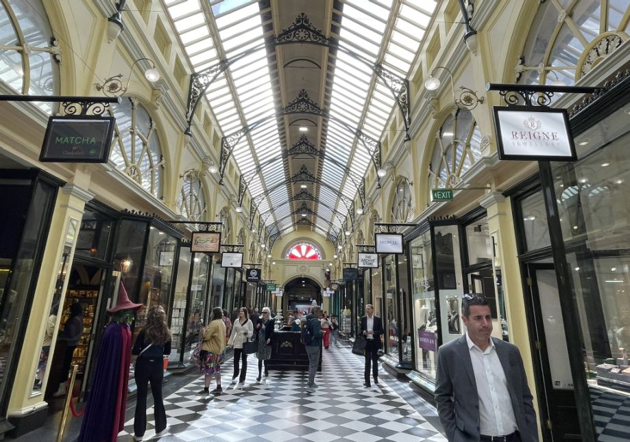 We are now walking in the famous main arcade with soaring arched glass ceiling that lets in soft, natural light, giving the passage a bright and airy feel while still being sheltered from the weather. The iron framework and detailing were inspired by the Galleria Vittorio Emanuele II in Milan, which is why the arcade feels so European in character.