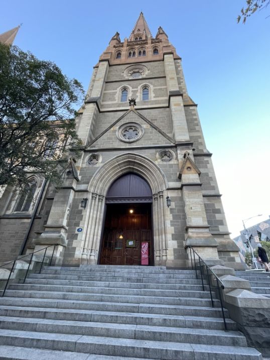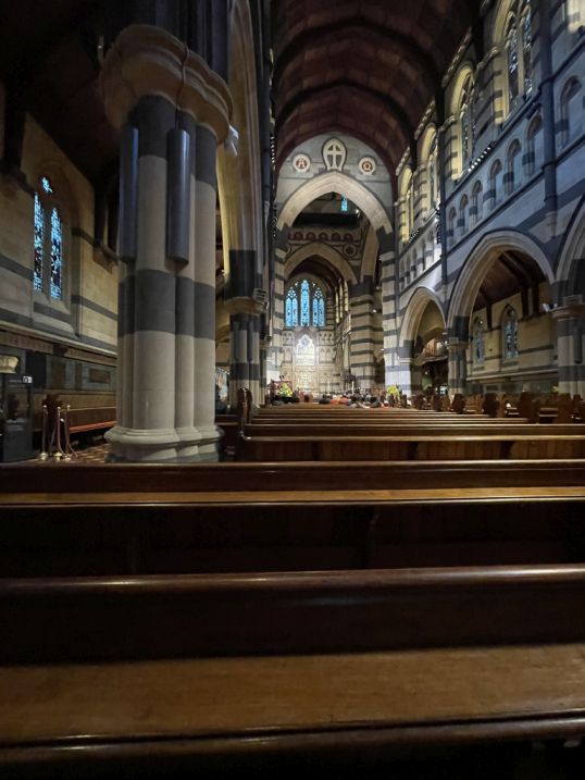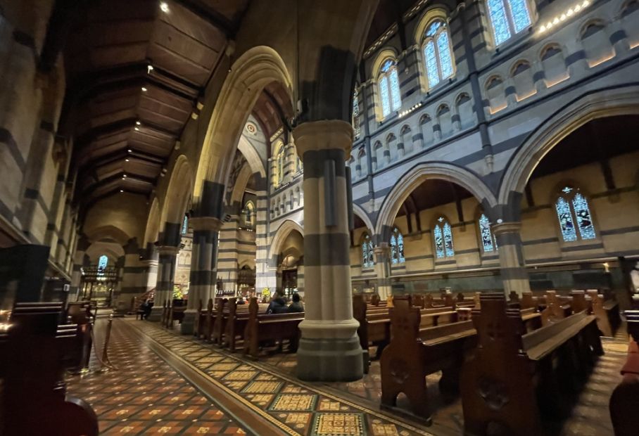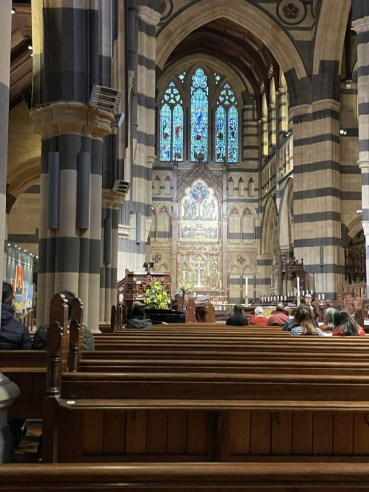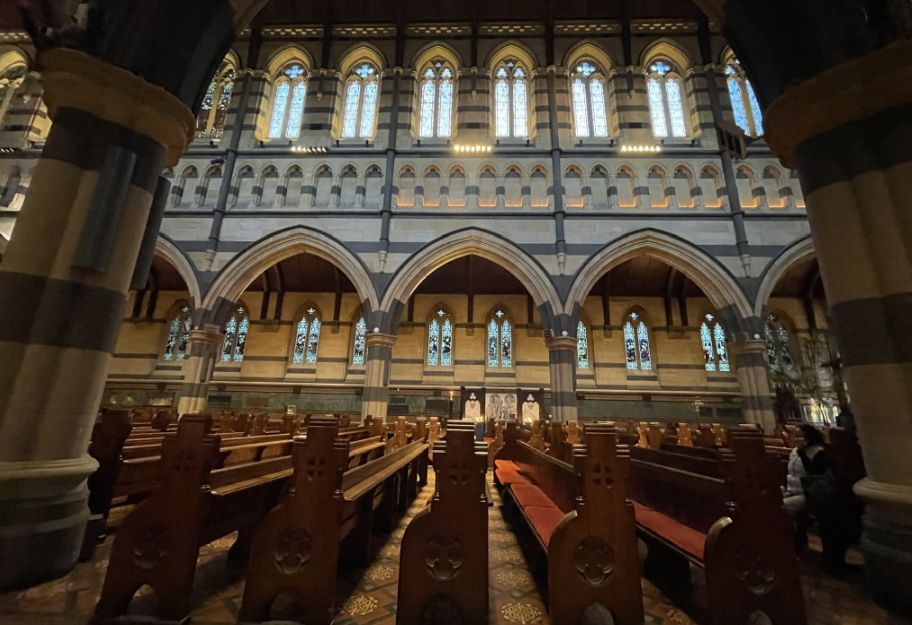 Standing inside, you feel the contrast between the bustling modern city just outside and the timeless calm of the Gothic interior , the cathedral really feels like a sacred retreat in the heart of Melbourne. Along the nave, you see a series of pointed arches supported by alternating black and white marble columns. Above the arches, the clerestory is filled with stained glass windows.