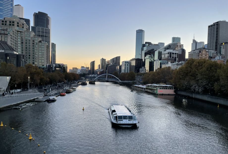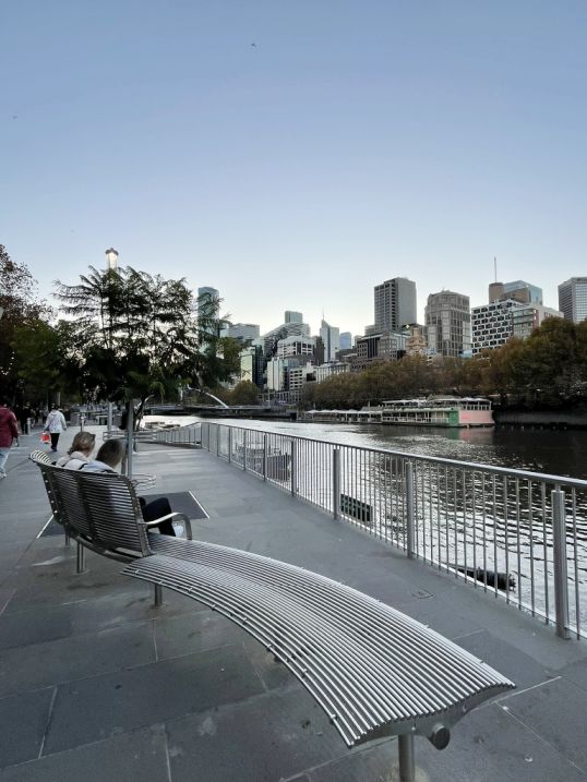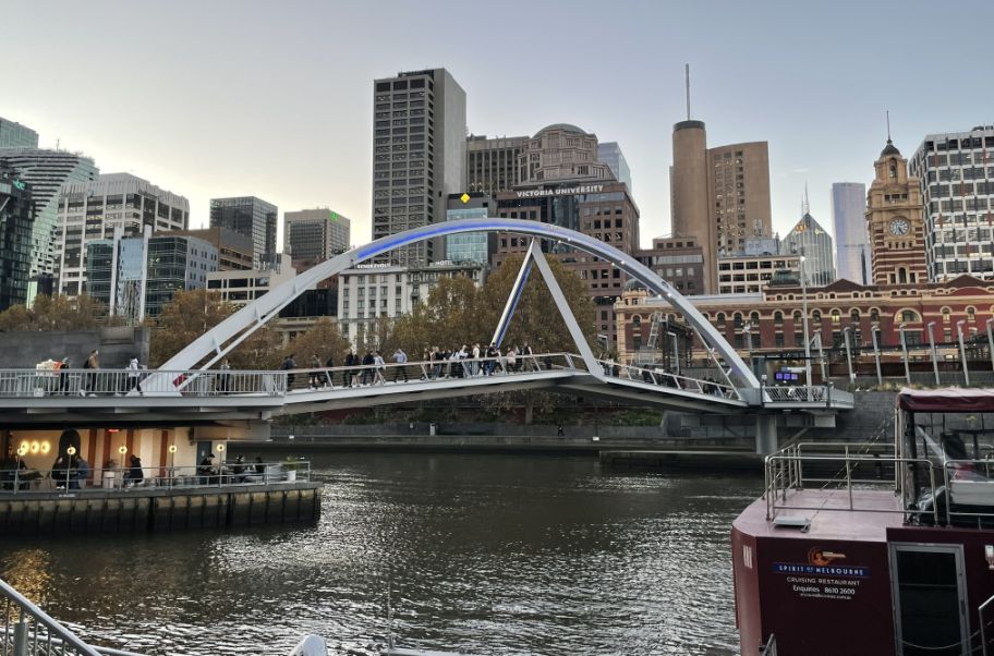 Walking across the Evan Walker Bridge is one of the most atmospheric experiences in Melbourne, especially at sunset. The footbridge arcs gracefully over the Yarra, connecting Southbank with Flinders Street Station and Federation Square, and seeing them from a slightly different angle made them feel even more striking. Beneath the bridge sits a floating restaurant and bar, its lights starting to flicker on as the evening settles in.