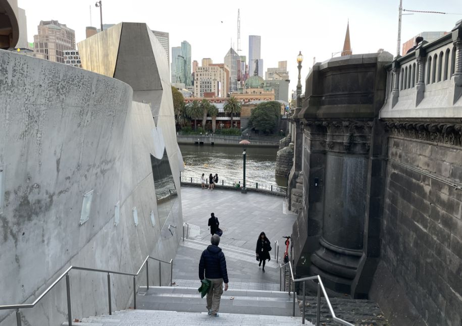 Stepping down the stairs from Princes Bridge to get to the Southbank Promenade.
