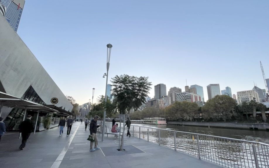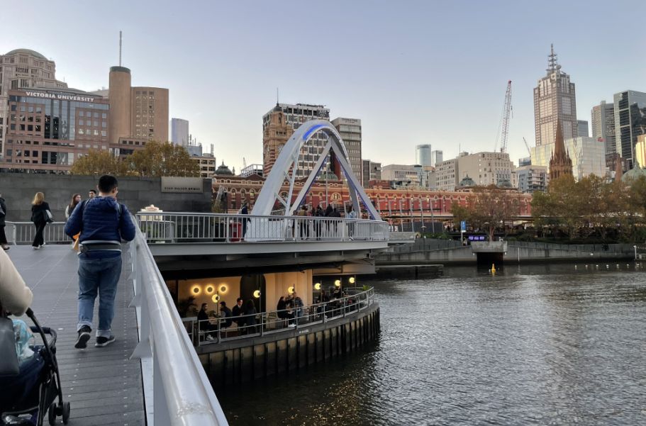 We are now walking along Southbank Promenade, the riverside walkway that runs beside the Yarra River. It stretches from Princes Bridge all the way past the Evan Walker Bridge and further along, lined with cafés, restaurants, and open spaces. In the evening, especially at sunset, it can feel calm and spacious, with the city’s reflections shimmering on the water and fewer crowds compared to the daytime rush.