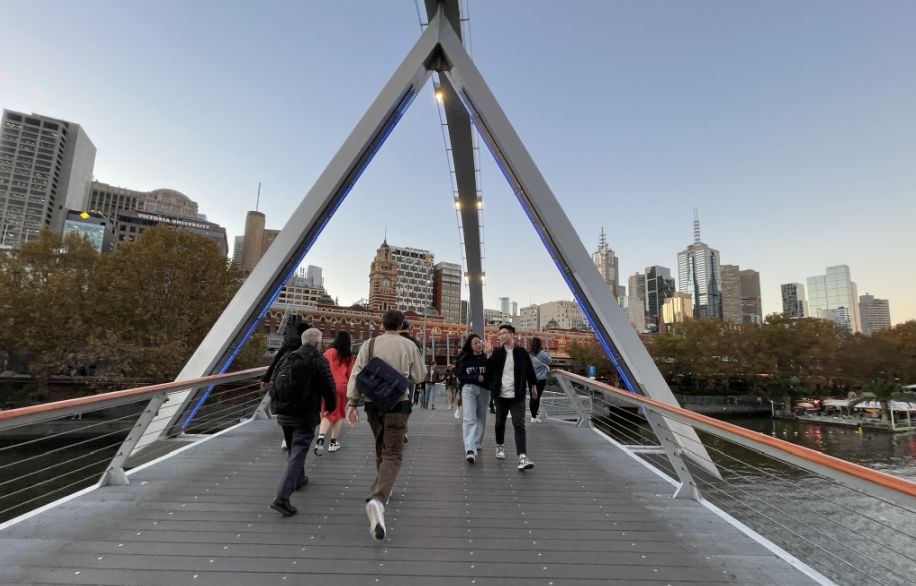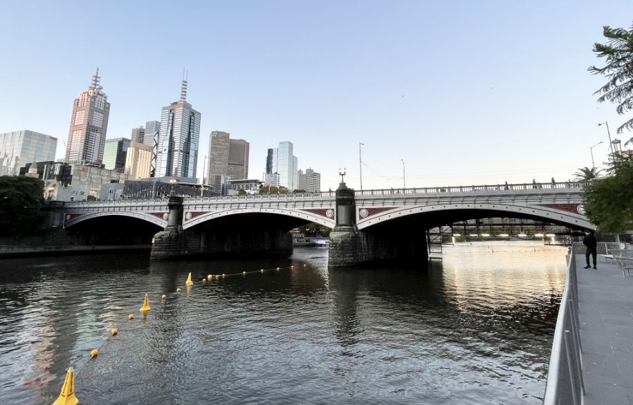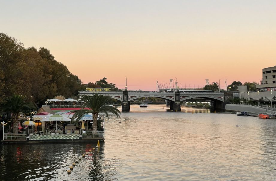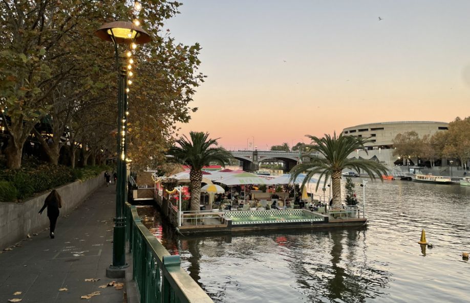 From the end of the Evan Walker Bridge, the view opens wide and feels almost cinematic. To your right, the graceful arches of Princes Bridge frame the river, its stonework glowing softly in the fading light. To the left, Arbory Afloat stretches out over the water, lively yet calm against the evening sky. The Yarra below reflects it all, the orange and pink hues near the horizon, the silhouettes of buildings, and the shimmer of lights just beginning to appear. Standing there, it feels like the whole city is pausing with you to admire the sunset..