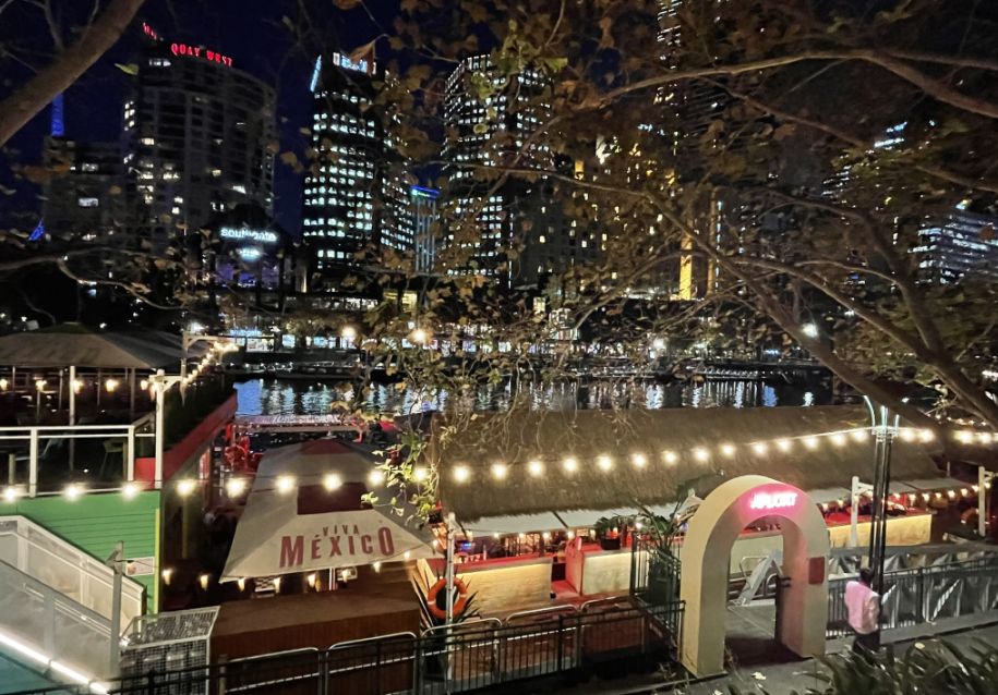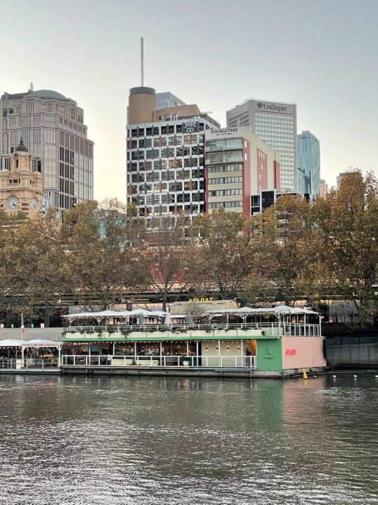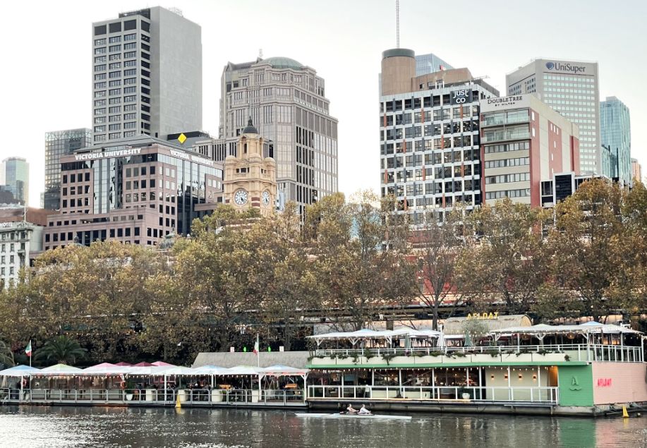 Across the river we see the floating Arbory Afloat restaurant and bar that sits right on the Yarra, and behind it rise some of Melbourne’s tall skyscrapers. The building with the clock you see is Flinders Street Station, one of Melbourne’s most iconic landmarks. Its historic façade and large dome stand in striking contrast to the modern towers nearby, giving you that classic blend of old and new that defines the city’s skyline.