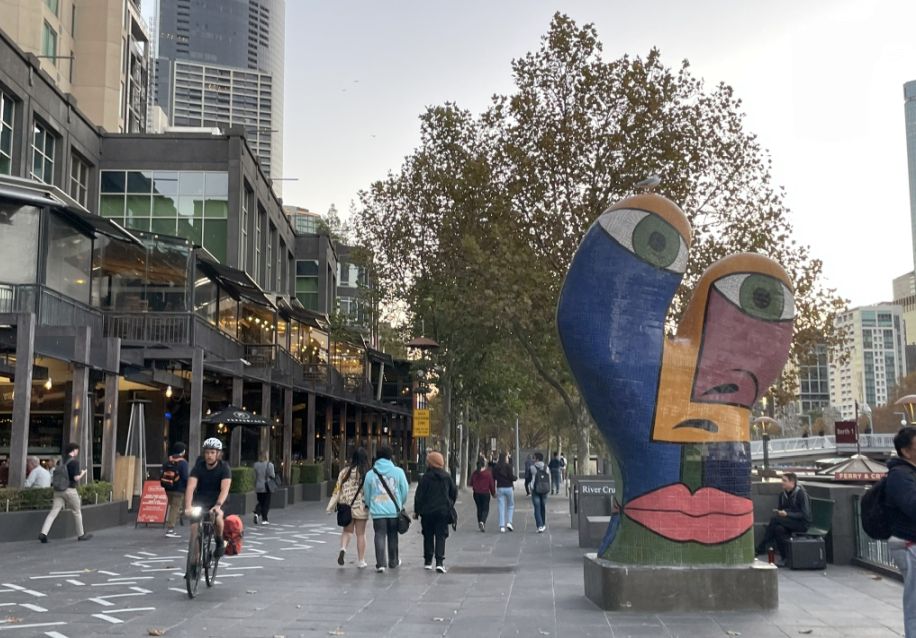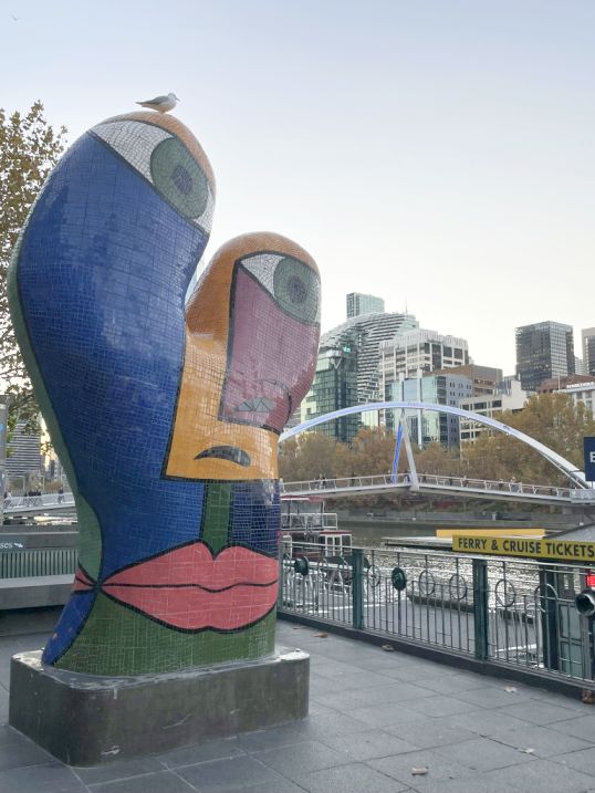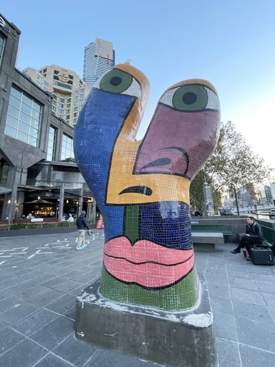 Standing brightly along Southbank, it’s a whimsical figure with bold patterns, two mismatched eyes, and vibrant colors splashed across its body. The playful design feels almost like a mosaic come to life, watching over the river walk with a sense of fun and creativity. It has become a bit of a symbol of Melbourne’s artistic spirit, perfectly at home along the Yarra with the city skyline as its backdrop.