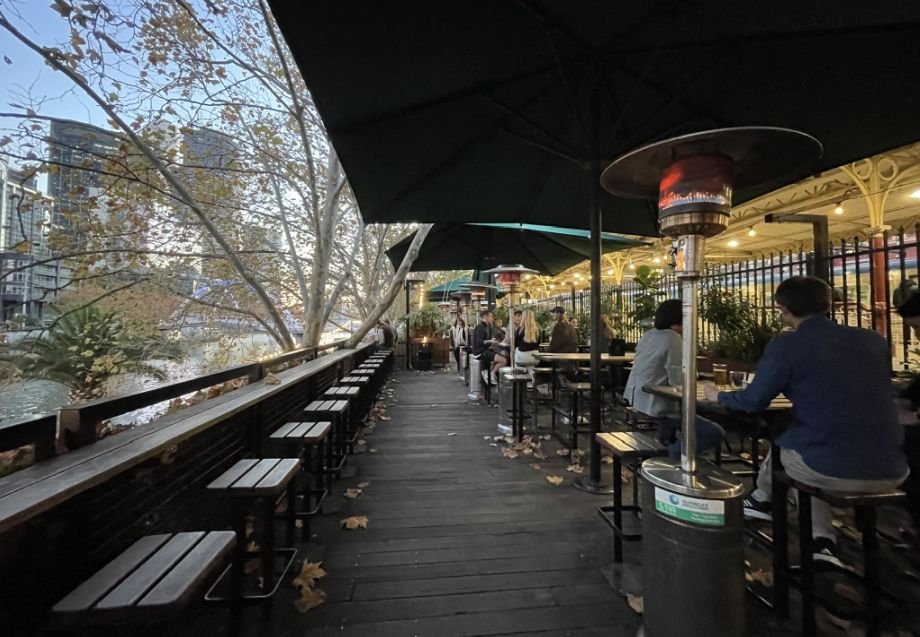 We are now at the Arbory, a perfect way to end your riverside walk. The long wooden deck stretches right along the Yarra, with tables shaded by umbrellas and a relaxed hum of conversation all around.