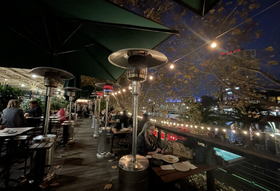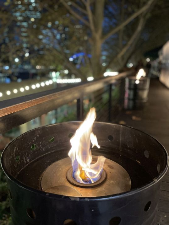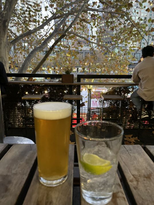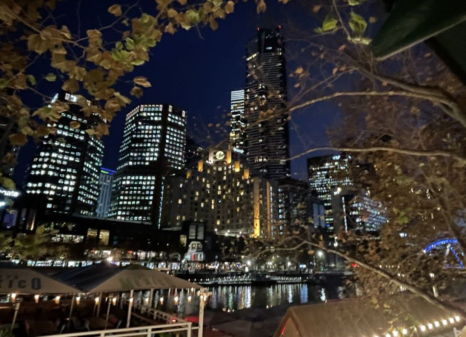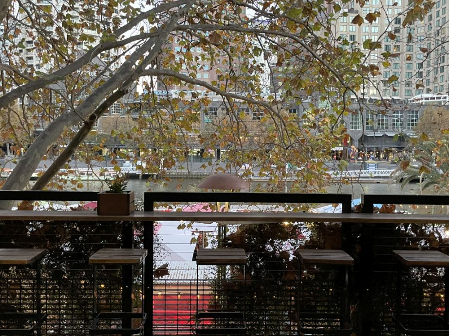 From our spot at Arbory, the view stretches along the river with the long wooden bar lined with chairs facing outward. Just beyond, the Yarra flows quietly, and above it, trees with golden leaves arch gracefully over the water, catching the last light of the evening. Across the river, the base of the high-rise buildings peeks through. It’s a mix of nature and city, golden leaves brushing the river in front of us, and the modern skyline rising just beyond, giving that uniquely Melbourne balance of calm and energy.