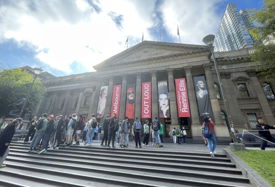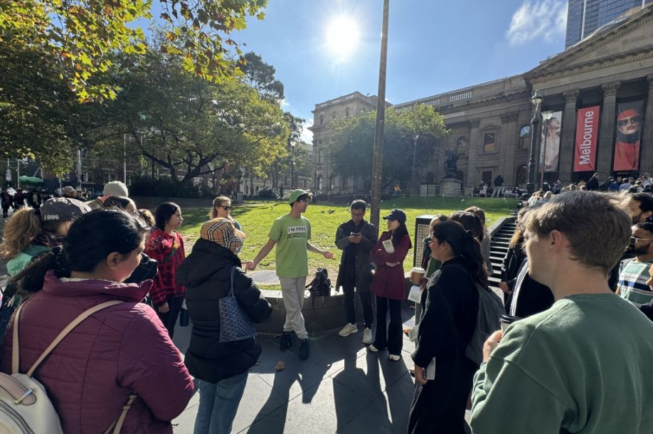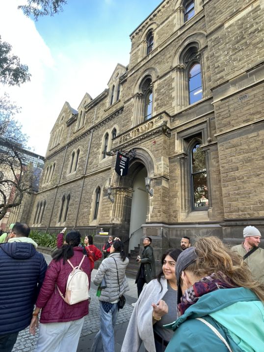 After breakfast we are headed to the Grand State Library of Victoria to meet with our tour guide. The library’s impressive façade, with its neoclassical columns and sweeping staircase, was the perfect starting point. Out front, there were a lot people standing around. I think there was like a open call for candidates to be selected in the Amazing race for Australia.