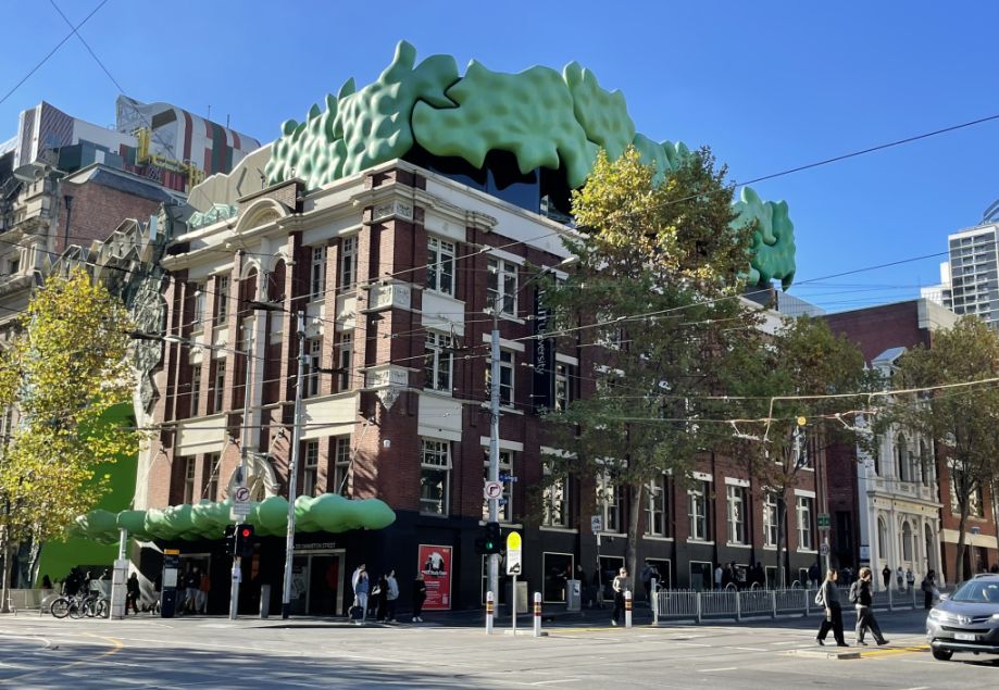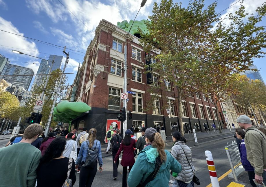 Crossing the street and the façade of the Green Brain building at RMIT University is bold, futuristic design covered in irregular green geometric panels, standing out sharply against the more traditional city architecture around it.