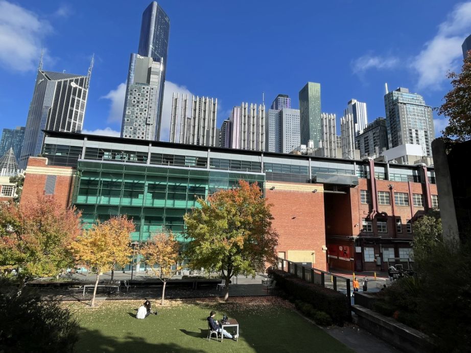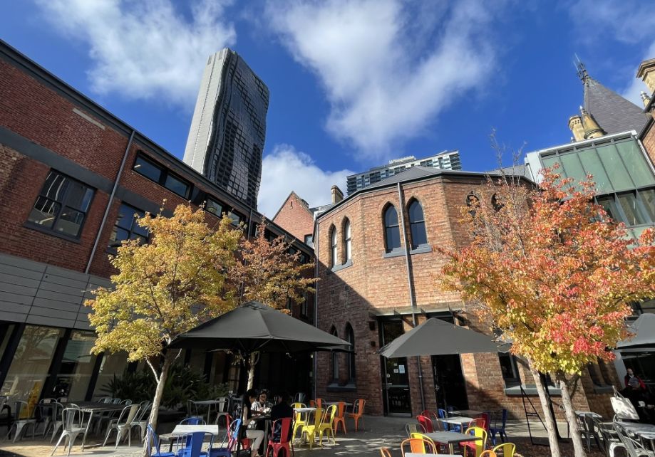 As we walked into a brick-lined courtyard at the University of Melbourne / RMIT area, the contrast of old and new really stood out. The heritage brick buildings around the courtyard give it a warm, historic feel, while the scattered tables and chairs make it an inviting, social space where students gather between classes.