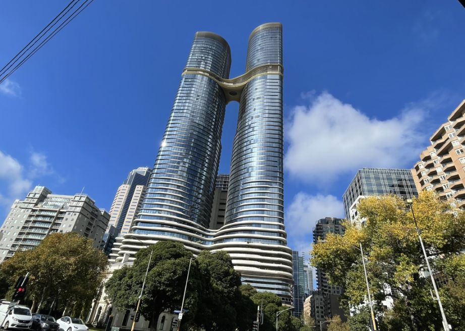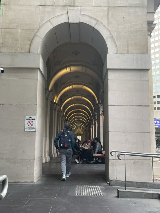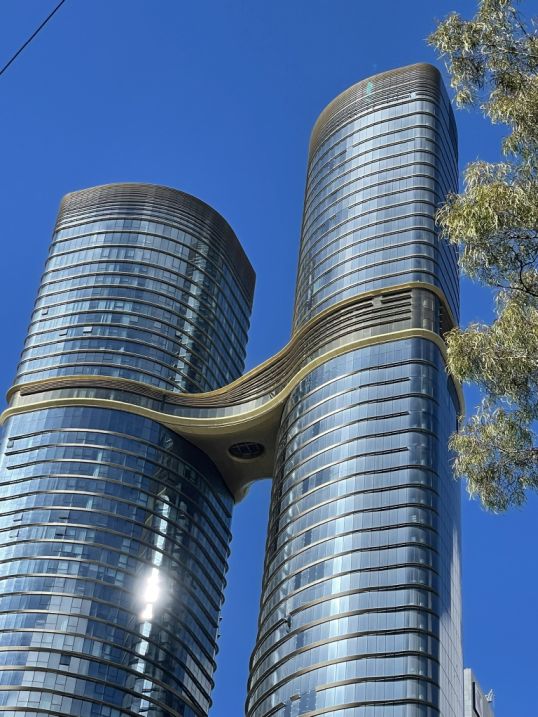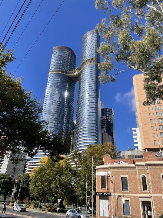 We passed by Collins Arch, one of Melbourne’s most striking new landmarks, a pair of glass towers joined high above by a sky-bridge that gives the whole structure its iconic arch shape.