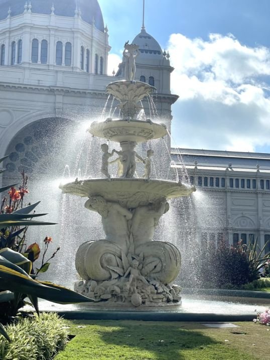 In front of the Royal Exhibiting Building is the Hochgurtel Fountain, designed for the 1880 Exhibition by sculptor Joseph Hochgurtel. It stands near the southern entrance of the Royal Exhibition Building, serving as a centerpiece in the formal garden layout.