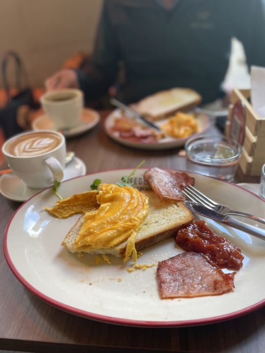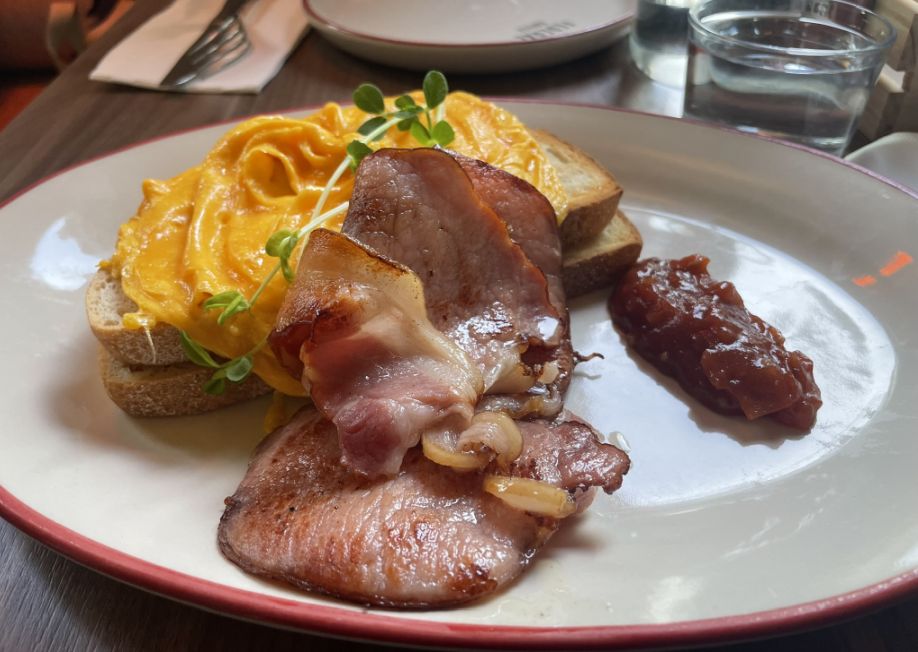 We ordered a scrambled eggs on sourdough toast with ham and apple jam.