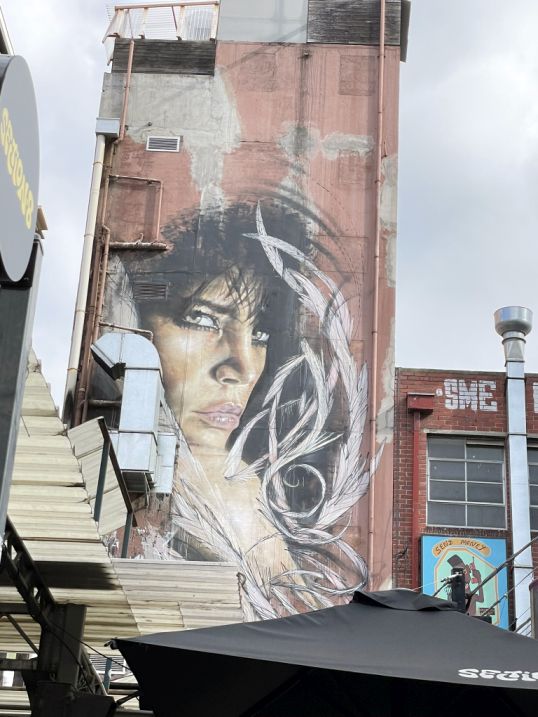 Rone (Tyrone Wright), a well-known street artist from Melbourne, famous for large, elegant portraits of women often done in a monochrome or limited palette, painted the mural in 2014, on the facade of the building at 80 Collins Street, in the so-called “Paris End” of Collins Street. It’s one of his biggest works to date. The face is of model Teresa Oman. The portrait is tall, very elongated due to the building’s height, with the hair falling down in waves. Rone’s style often involves creating mood and atmosphere, using play of scale (big-scale portrait on building façades), subtle tones, and sometimes weathered concrete surfaces to give texture. The mural both beautifies the street and draws attention to art in public space.