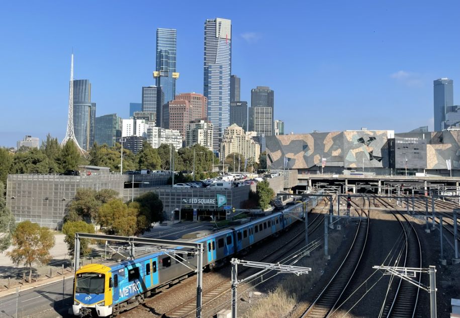 From behind Flinders Street Station, the city feels both historic and modern all at once. The train tracks stretch out in front of us, a web of steel carrying constant movement, while the skyline rises beyond in striking contrast. The curved silhouette of Collins Arch (blue building in the center), the gleaming height of the Eureka Tower (on the right), and the delicate spire of the Arts Centre Melbourne (far left) all stand tall against the sky, markers of Melbourne’s architectural diversity. From this vantage point, we are on the threshold between the urban core and the green expanse of the Royal Botanic Gardens ahead.