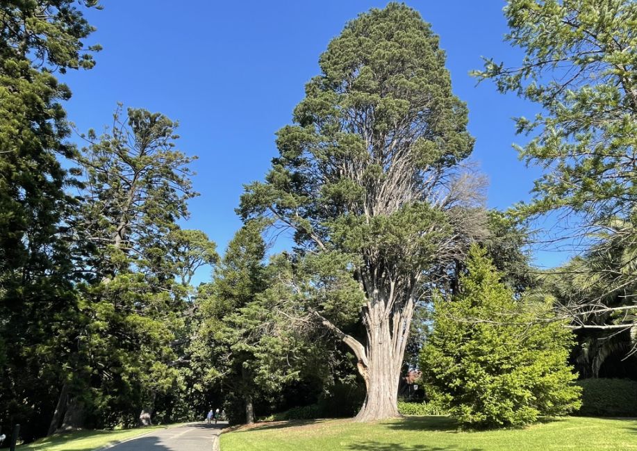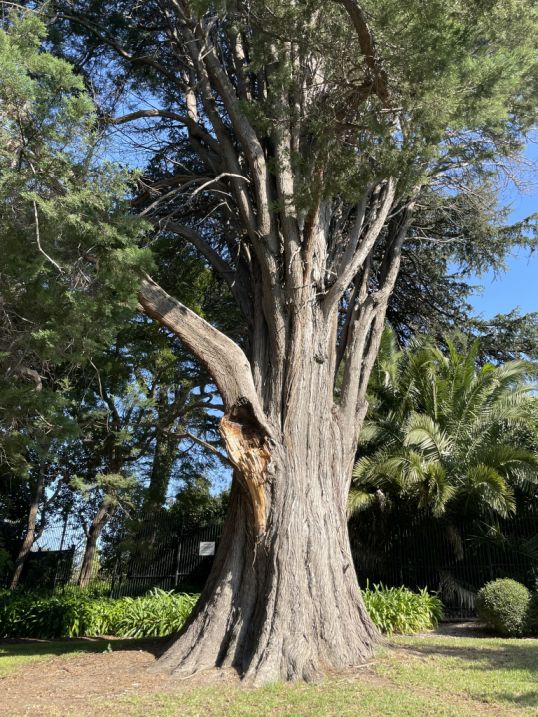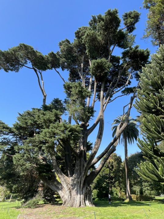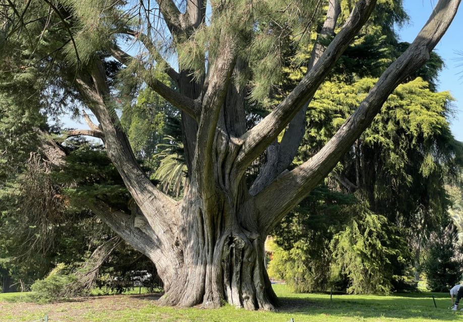 Huge Monterey Cypresses (Cupressus macrocarpa), a species native to the California coast but planted in Melbourne’s Royal Botanic Gardens in the 19th century. These trees are famous for their massive, gnarled trunks that seem to split into multiple thick branches low to the ground, creating wide, sculptural forms. Over time, their twisting limbs spread outward almost like great arms, giving them a dramatic, almost otherworldly presence. Many of them here are well over a hundred years old, and their size reflects both age and the perfect growing conditions provided by the Gardens.